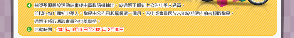 4. 抽獎獎項將於活動結束後由電腦隨機抽出,於通路王網站上公告中獎人名單,並以E-mail通知中獎人,贈品由公佈日起算保留一個月,若中獎會員因故未能於期限內回覆或取得聯繫,通路王將取消該會員的中獎資格。